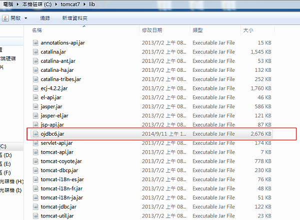 - Oracle JDBC Driver :放置 Tomcat 安裝的位置,例如:C:\tomcat7\lib