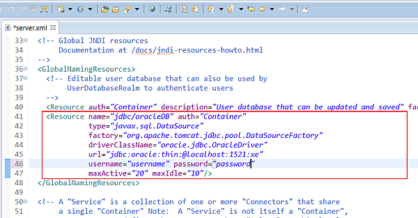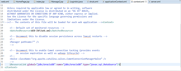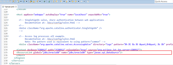 <ResourceLink global ="jdbc/oracleDB" name ="jdbc/oracleDB" type="javax.sql.DataSource"/>